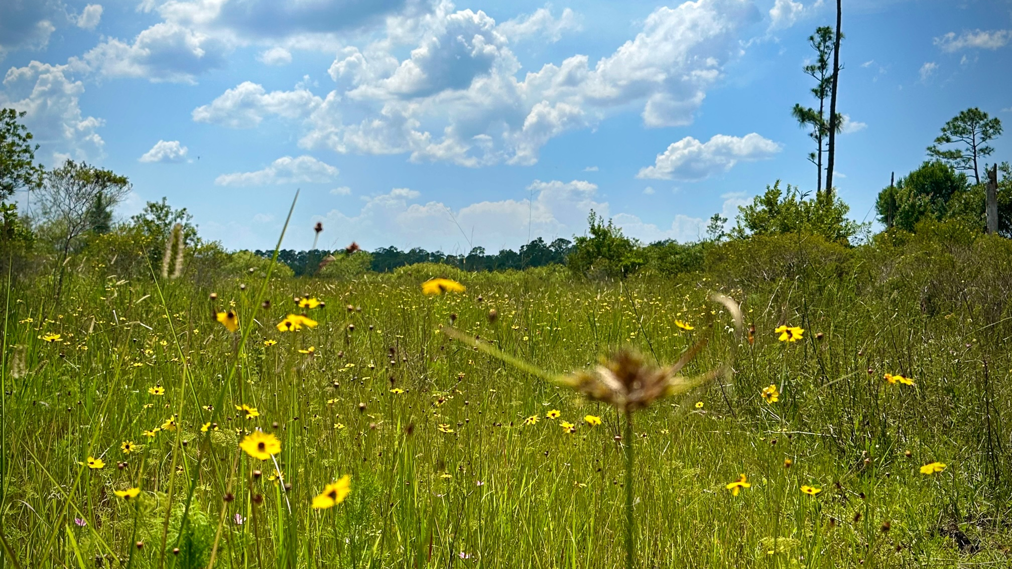 Other than the noise I was making, my hike was quiet. Bromeliads and air plants clung to the cypress. Birds flew from tree to tree. I emerged from a cypress strand onto a short section of somewhat dry trail and completed a bug and critter check on my legs, trail runners, and arms. Clear so far!
